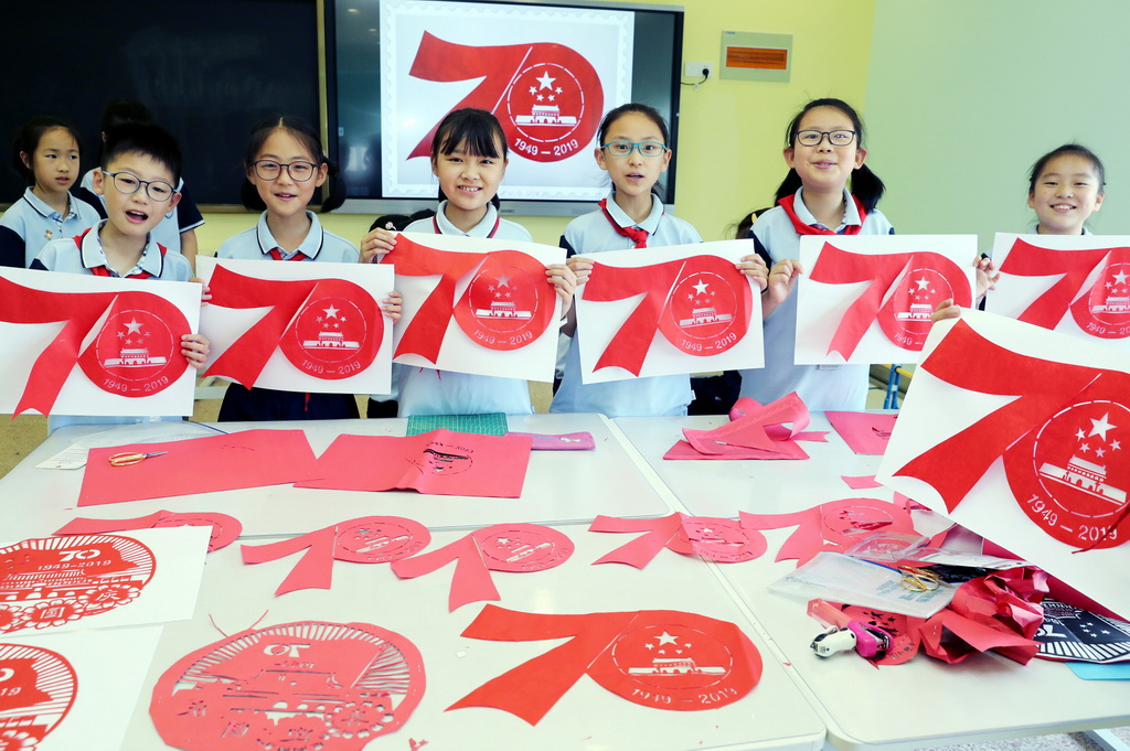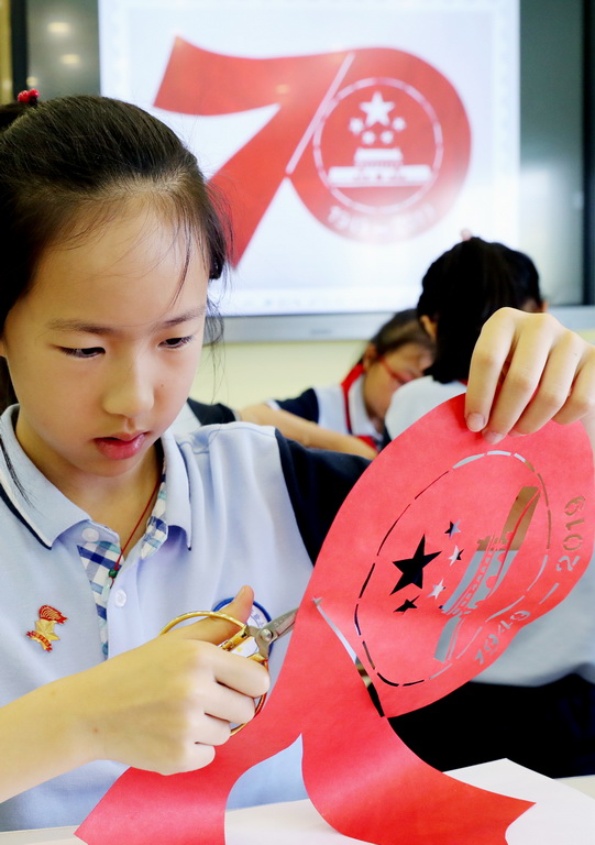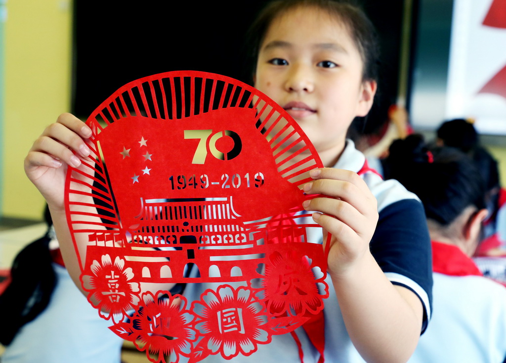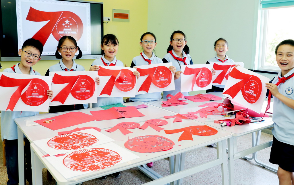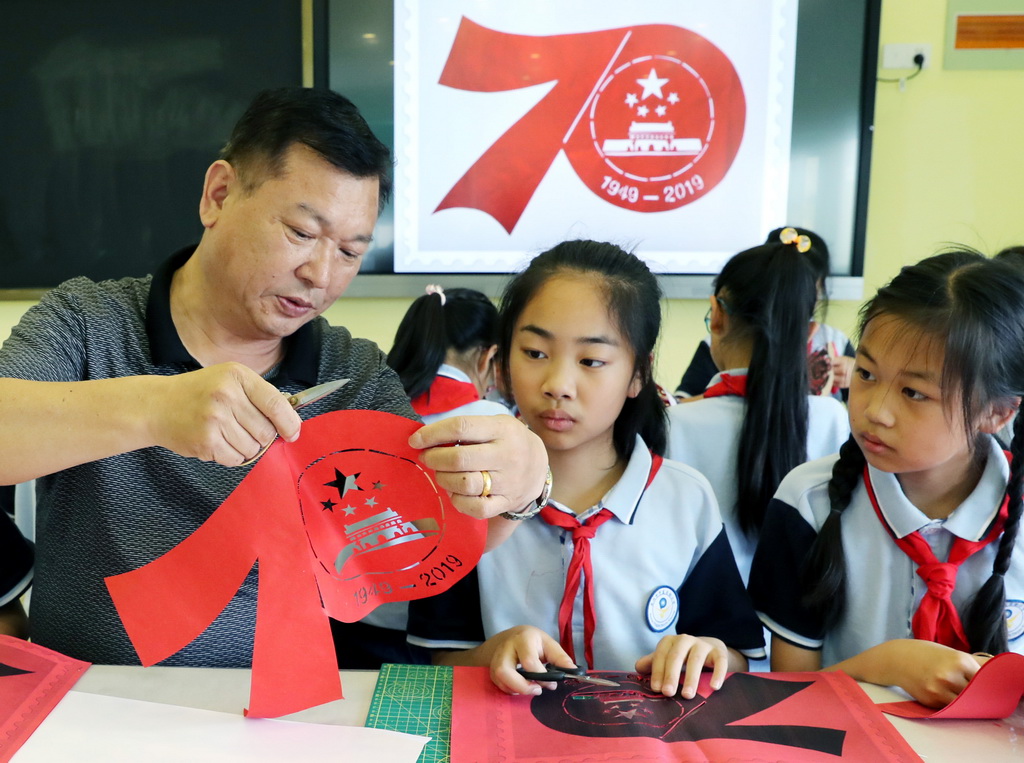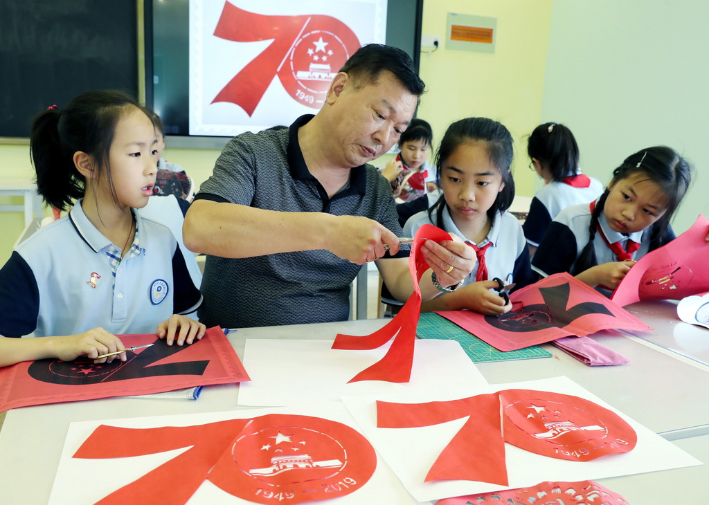 6月11日,江苏省苏州市平直实验小学剪纸社团的学生们,在工艺美术师金国荣的指导下,孩子们用一双双巧手,通过折叠、镌刻、缕刻剪纸技艺,创作了《天安门》以及“中华人民共和国成立70周年”标识等作品,反映了新中国伟大历程和成就,表达了童心向党迎国庆的喜悦心情。