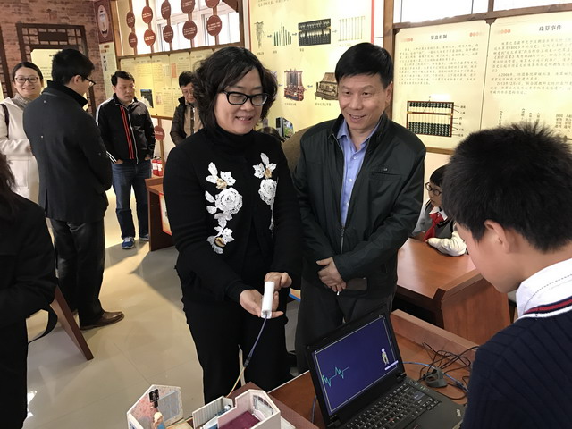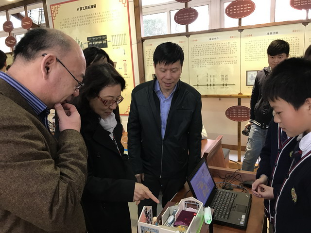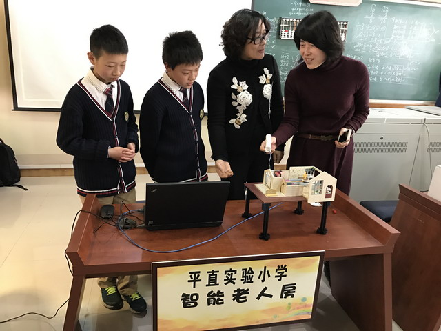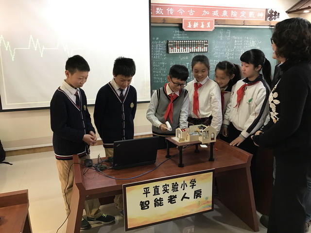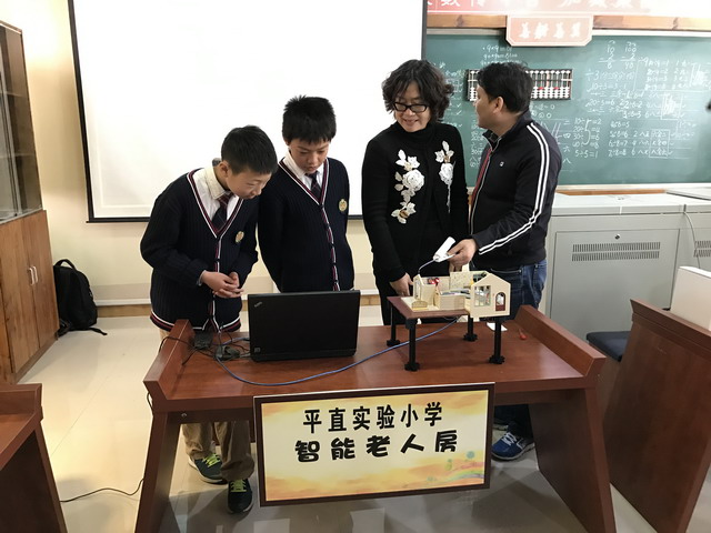 平直实验小学创客作品《智慧老人房》吸引了《中国电化教育》杂志社社长许林、中国教育学会中小学信息技术教育专业委员会秘书长陈美玲以及文化教育委员会郑云副主任的目光