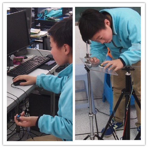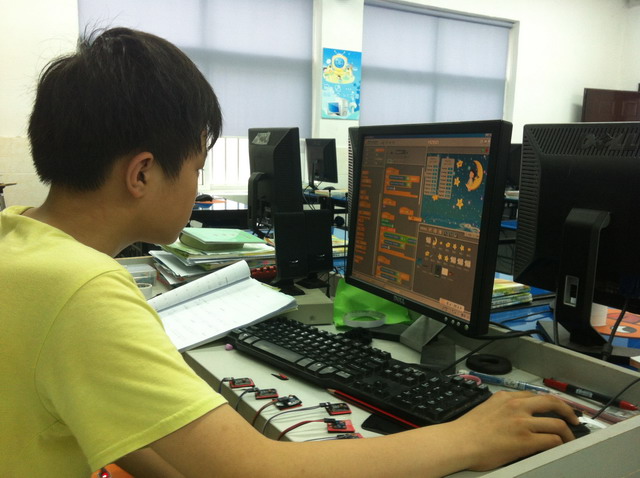 把光敏原件贴在电脑桌上,S4A互动调试智能钢琴,这项目深深地吸引了学生,让他们投入更多的热情参与其中。