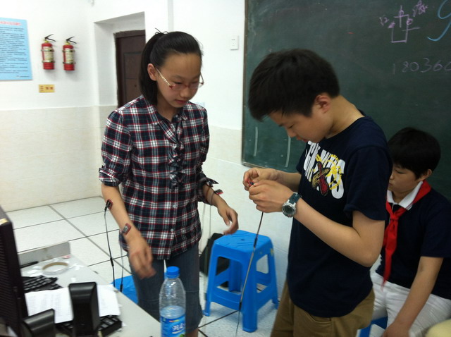 他学校的同学们争先恐后排队体验平直实小的脉搏检测监护系统