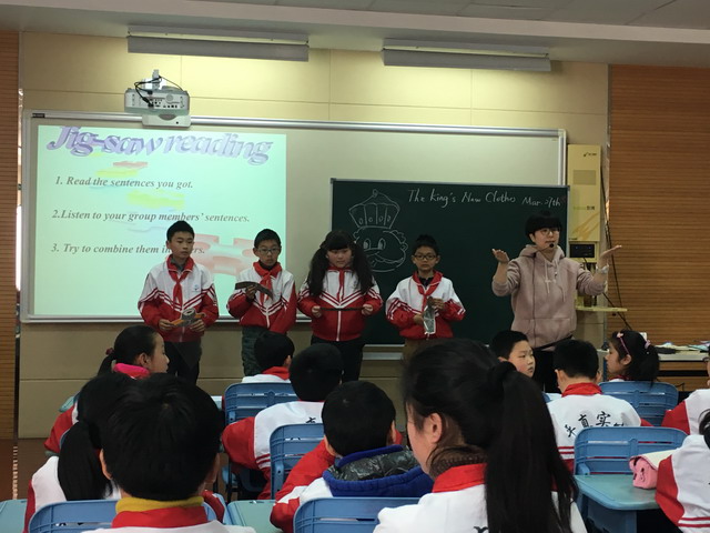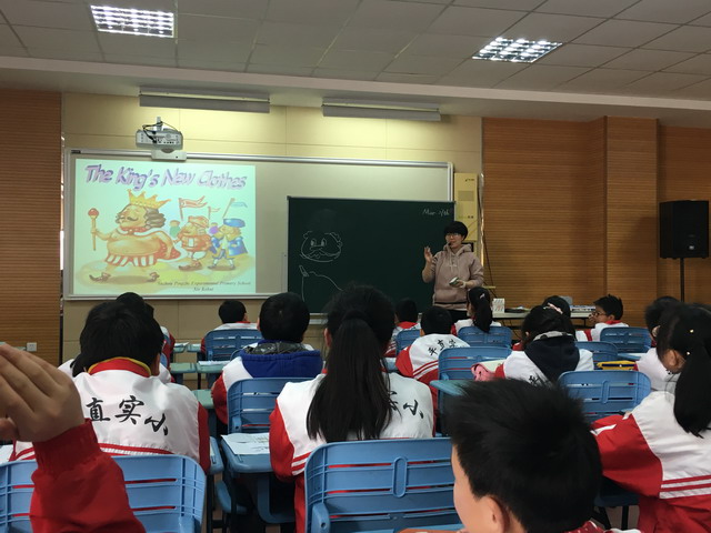 首先,由我校谢克惠老师执教了展示课《The King’s New Clothes》。这是一则对于学生而言既熟悉又充满趣味性的小故事。旨在通过学习故事,让学生了解整个故事的发展过程,引导他们去感受主人公的情绪变化,并最终能在理解故事与任务的基础上,表达自己的想法与感受。因此,在谢老师的教学设计中,先以主人公的形象进行导入,通过一系列的形容词对其不同的身份进行猜测,为之后的故事教学做好铺垫。随后谢老师结合不同的阅读策略与问题的引导,让学生对故事始终充满好奇心与探索心,以达到各层次的教学目标。