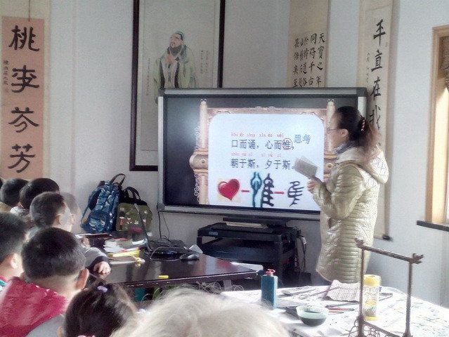 课间,小朋友吃着家长带来的点心和牛奶,看到王老师来了,他们把他围了起来,一起分享着乐活仙谷的精美画面。课堂上王老师给小朋友们猜甲骨文字并讲解着故事,小朋友们踊跃地回答问题。甲骨文的学习,让孩子们受益匪浅。孩子们要求王老师多讲一些故事,但是下课的铃声已响起,大家只能期待下一周的课程了!