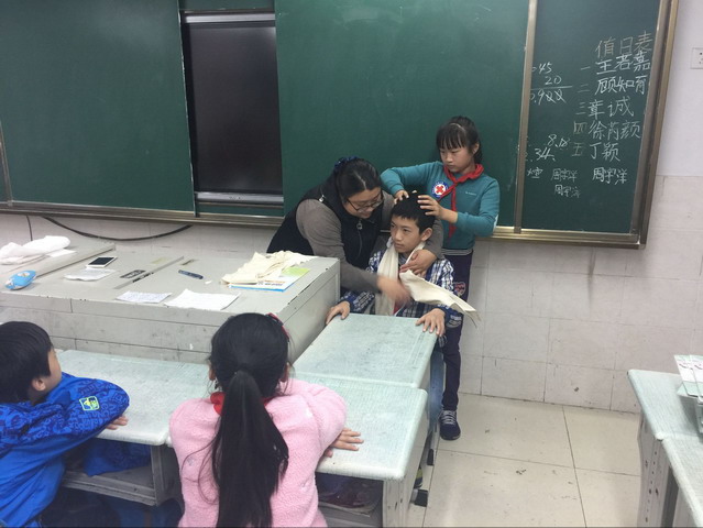 活动中,志愿者老师们教授学生们认识三角巾、绷带等救护用具,手出血了,腿碰伤了,又该如何处理。学生们听得聚精会神,学着老师的样子,和同学互相包扎,亲手实践,提高技能。