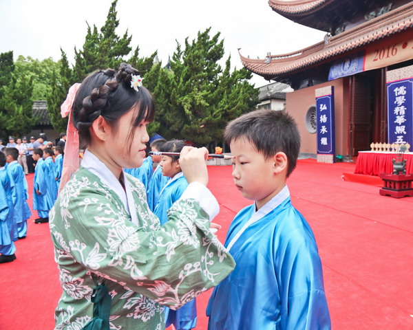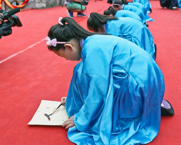 我校学生有幸参与了祭孔典礼环节中的开笔礼仪式。上午938分,祭孔典礼正式开始。在雄浑的鼓声中,率先进行的是还原古代启蒙学习仪式的国学学堂开笔礼,这也是开笔礼首次亮相祭孔典礼。40多名身着汉服的我校三年级学童,通过整衣冠、拜孔子像、朱砂开智、击鼓鸣志、描红“人”字、感恩鞠躬等仪式,接受传统启蒙教育,