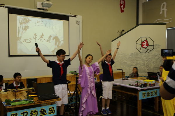 平直实验小学的scratch创新作品“穿越时空的奇迹”是学生利用Scratch编程软件与艺术相结合的项目,学生利用普通的三脚架、笛子和废旧的跳舞毯上加装了触动传感器、光度传感器等,使不起眼的材料变成了鲜活的架子鼓、笛子和跳舞毯。创新项目分为四个部分展开,其一.笛声悠悠,书声琅琅诵白词经典;其二.舞姿袅袅,风扇依依绘古韵今风;其三.鼓声阵阵,笔走墨飞展万马气象;其四.童心昭昭,书韵洒洒铭心平至直。伴随着阵阵鼓声电脑屏幕上随之绘画出一匹奔腾的骏马,在澎湃激昂地打击乐下顿时呈现出万马奔腾,其寓意着百年老校奔腾不息,执着不已的精神。笔走墨飞,学生用超声波传感器写出了心平至直的百年校训。