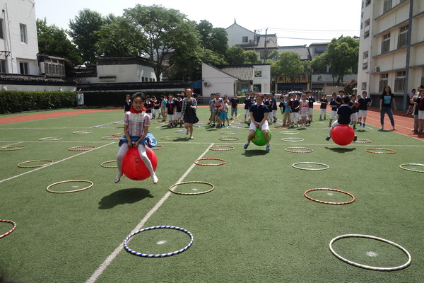 跑和五六年级的跨越式跳高,既能发挥学生的个人能力,充分展示学生个人风采;又有趣味性的团体项目,比如:一二年级羊角球接力跑、三四年级呼啦圈你追我赶和五六年级五人六足绑足跑,可以充分培养学生的团结协作精神。