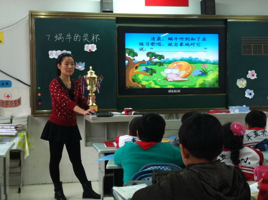姜老师是工作才两年的新老师。可是,她的课中却带着自己的思考。她面带微笑,亲切自然,用趣味十足的谜语作为导入,孩子们的兴致一下子高昂了起来;在理解词语上,她能采用多种方法,让学生充分地理解;用上大大的奖杯,让学生亲自捧一捧,感受“很大很重”,实物的形象直观让学生一下子就理解了重点词句。