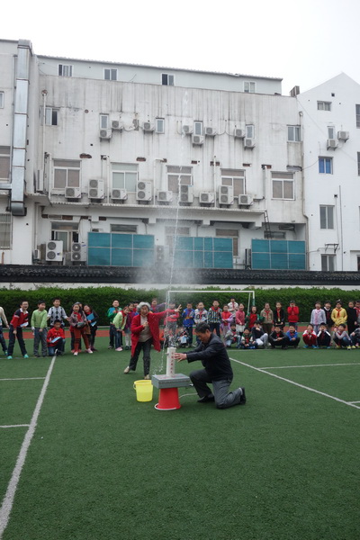 在讲座之后,所有人来到操场上,一起见证火箭的发射。小小的水火箭,威力十足,发射竟有8层楼,火箭从校园里发射!火箭从自己身边发射!“太不可思议了,太神奇了!”孩子们看得目瞪口呆,情不自禁地拍手称赞,亲眼看到火箭的发射,亲眼看到这神奇的时刻。
