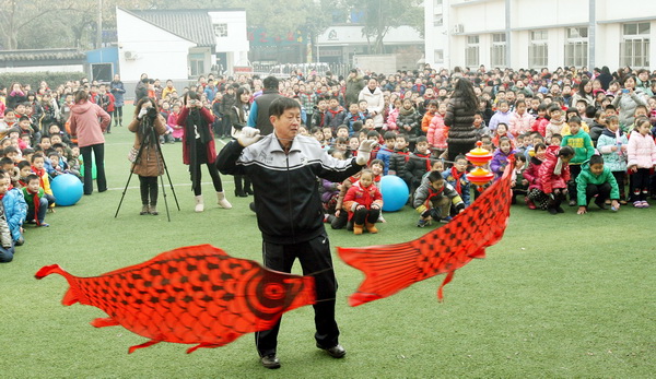 在启动仪式的现场,学校请到了由邱老师带领的空竹队,他们在司令台进行了精彩的表演,他们娴熟动作极具韵律美,空竹抖动的声音富有节奏感,师生们看得眼花缭乱、热血沸腾,孩子们的眼中充满了羡慕,他们跃跃欲试,恨不得立刻上台学一学呢!各班的学生代表走上台前向老爷爷、老奶奶们学习如何抖空竹,兴奋、喜悦的表情浮现在那一张张可爱的小脸上。