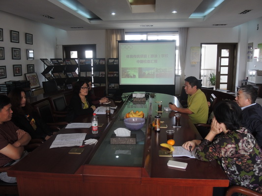 徐玉英校长代表学校做了专题的PPT汇报。徐校长从学校总体情况、传统项目开展情况、传统项目所获得的成绩等方面介绍了学校游泳项目建设发展情况。与会领导对我校积极迎接检查,资料准备充分以及近年来我校在游泳项目上取得的突出成绩给予了高度的评价。