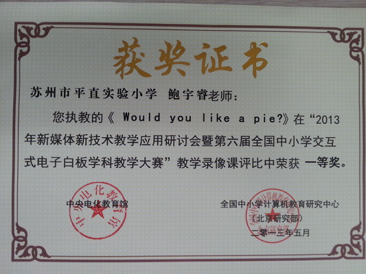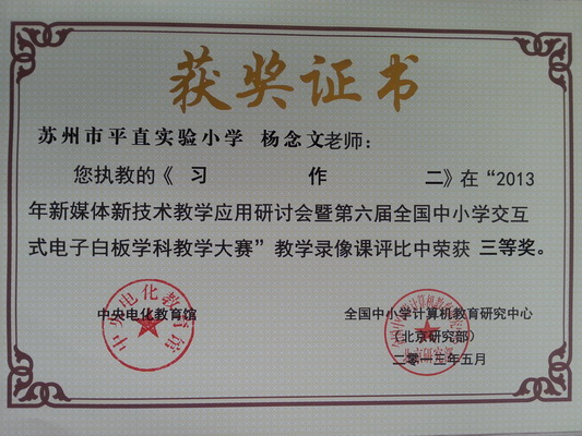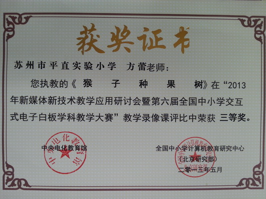 年新媒体新技术教学应用研讨会暨第六届全国中小学交互式电子白板学科教学大赛中分别获得一等奖和三等奖。