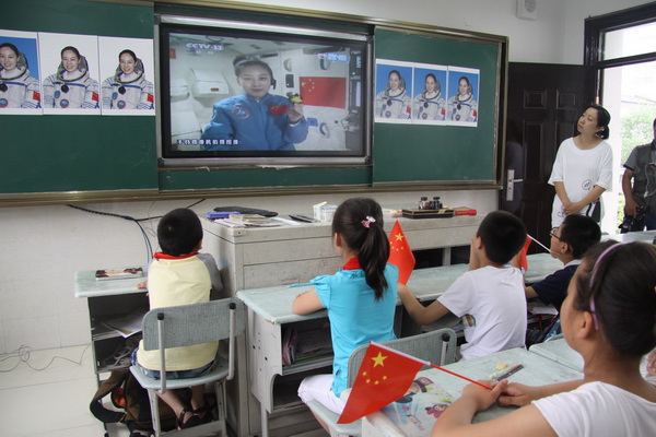6月20日上午10时许,神舟十号的航天员在天宫一号这一“中国的最高讲台”开展太空环境下的科学实验,为全国青少年进行太空授课,平直实小也组织全校师生共同收看太空授课实况,以直观地认识失重环境下物体运动特性、液体表面张力特性等科学现象。