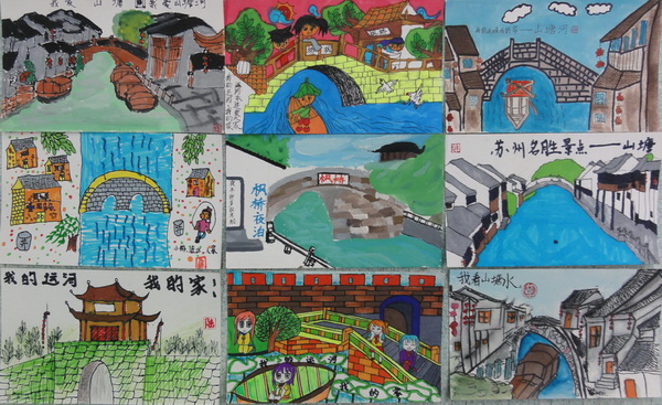 2014年大运河要成功申遗是我国务院确定的一项重大文化工程,苏州是重要的运河古城,因运河衍生的文化遗产数量也多,类型丰富、价值很高,而苏州又是国际专家前来中国重点考察的城市之一,为了进一步传播大运河遗产知识,更好地激发广大学生爱国爱家乡之情,积极引导他们参与到运河遗产保护行动中来,我校中高年级学生在美术老师们的指导、带领下,满腔热忱地参加了苏州市教育局、苏州市文物局与苏州市关心下一代工作委员会联合开展“我的运河我的家”苏州市中小学生画信支持大运河申遗活动。双休日里,他们走出校园、走入街巷、走近运河,零距离观察苏州古城的各种风貌,在古城墙下、古石桥上以及平江、山塘等历史街区里徜徉,认真体会苏州运河人家的生活精髓,了解姑苏民俗风情,回到学校认真回忆创作,用画信的方式表达自己的所见所闻、所思所想,他们有的用儿童画方式画出了苏州小桥流水人家风情;有的用国画方式笔墨挥洒出苏州古运河两岸的无限风光;有的用水彩画方式画出了姑苏老城门的古韵风雅……