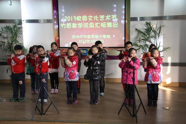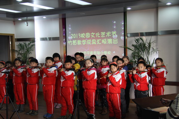 新年伊始又临近期末,学习紧张而又充实,但在平直实验小学的校园里,欢声笑语却无处不在。体育节、科技节刚刚结束,校园文化艺术节又拉开了序幕。1月10日下午三点整,在学校报告厅举办“2013校园文化艺术节竹笛教学成果汇报演出”,特邀请家长代表与孩子们一同参加活动。学校为孩子搭建了一个展示才艺的舞台,同时也是艺术学科的另一种评价方式。孩子们盛装演绎,一板一眼,颇有架子,竹笛声声,令在座的家长和同学们如痴如醉,掌声不断。这些小演员们同时将获得学校颁发的“五有证书”之“艺术证”。