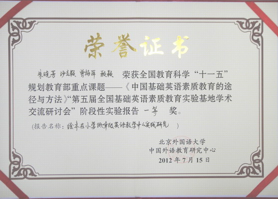 我们平直实小的《绘本在小学低年级英语教学中的实践研究》课题阶段报告荣获全国教育科学“十一五”规划教育部重点课题——《中国基础英语素质教育的途径与方法》“第五届全国基础英语素质教育实验基地学术交流研讨会”阶段性实验报告一等奖。我校以此课题来指导低年级学生进行自主英语阅读,培养学生语言生成能力,孩子们轻松快乐自然地习得了英语。