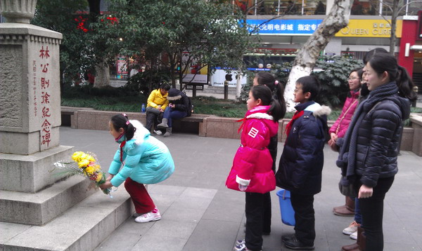 很自豪的是,我校在上学期被光荣地授予了“苏州市禁毒示范学校”的称号,让我们的孩子从小就明白关爱生命。为此,在3月2日我校的部分团员老师和学生代表一起前往观前小公园瞻仰了林则徐纪念碑,为它献上了鲜花,表达了我们对于英雄的无限敬意;红领巾们还轻轻地擦拭着纪念牌,把英雄的形象牢记心中;学生们还说着林则徐的故事,也要尽自己的力量传承着他们那种为人民无私奉献的精神。