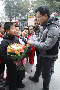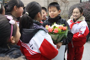 今天,这位小棋手凯旋回到母校,父母、教练、老师、同学们都用鲜花和拥抱来迎接他。大家与这位世界级的小小冠军分享成长的点点滴滴。陈邵马可给大家讲述了他在棋路历程中的收获与心得,台下的同学们听得投入,颇受感染,还上台学习了跳棋的基本方法,看马可和教练对弈。此时的陈邵马可成了同学们心中最闪亮的“明星”,看着台前自信满满、滔滔不绝的儿子,陈邵马可的父母可谓百感交集,他们说,眼前儿子光鲜的背后有太多太多学校的支持、老师的付出与家庭的坚持。