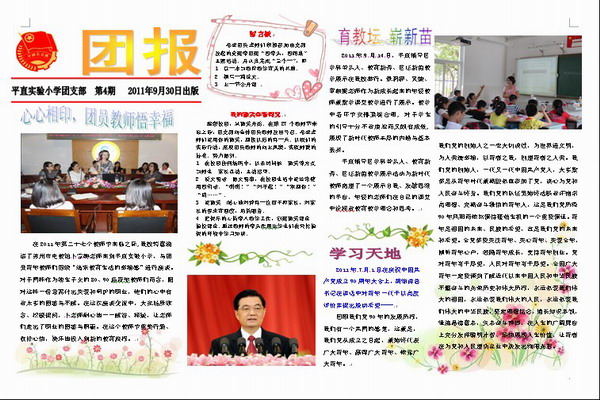 平直实验小学团支部团报第四期出刊了!版面虽小,但也涵盖了团支部近期的时事新闻、活动公告以及学习天地等多块内容。从出刊第一期以来,我支部一直努力想把团报做成团支部加强思想政治教育和开展新闻宣传工作的载体,使之成为支部联系团员青年乃至全校师生和社会的纽带,作为展示团员精神面貌、塑造学校品牌的窗口和平台。为了这个目标,我支部还需博采众长,创新思路,形成平直独有的特色!