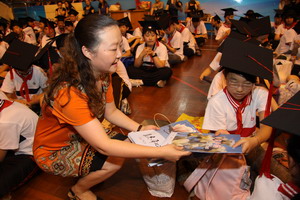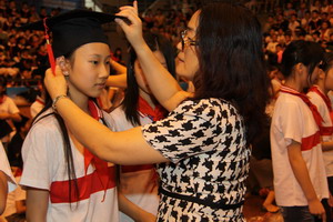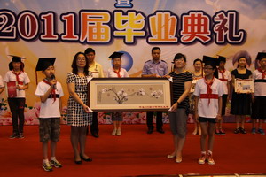 8点30分,2011届平直学子毕业典礼在一曲激昂高亢的《毕业歌》乐曲声中拉开了帷幕,回首六年来的青葱岁月,毕业生代表陈蓉蓉同学深情回忆在母校受教的点点滴滴,她郑重谈到了在母校时所接受的“三礼”教育。毕业礼,是平直的孩子在离开母校前需要接受的最后一项传统礼仪教育,它将是平直孩子们在人生旅途中一笔宝贵的财富。在大家期待的眼神中,副校长赵康一一宣布了平直每一个毕业学子的名字。孩子们以最质朴的方式向母校,向曾经含辛茹苦、默默付出的十五位班主任,向六年来传道授业、殷切关怀的全体平直老师们鞠躬谢礼。校领导们为顺利完成六年学业生涯的毕业生们授帽拨穗,发放毕业证书。毕业班班主任代表洪薇老师给即将远行的孩子们送上了五色祝愿,在洪老师深切的祝福声中,毕业班的班主任们为他们戴上了代表了爱、诚、礼、廉、孝的五色腕线,不论走到哪里,这是母校的一份期待、一份祝愿。手捧苦读六年心血的毕业成长袋,六(5)班冯正润同学的家长代表全体毕业生的家长感谢学校为孩子的辛勤付出、默默耕耘。毕业班的孩子们为母校送上了每班的画册以及象征着心平志直、淡泊高远的白玉兰刺绣。平直校长徐玉英在扬帆致辞中,感谢老师们的六年来培养了一批志存高远的合格学子,祝贺同学们六年来刻苦完成了小学阶段的学业任务,她热切地希望“蒲公英”们越飞越高、越行越远,有时间“常回家看看”。
