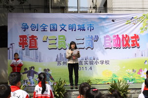 启动仪式首先由辅导区党支部书记代表杨红霞老师为广大师生致辞讲话,杨书记的《欢迎三岗》热切地希望我们全体师生真诚地来到三岗队伍中,为学校、为他人、为社会敬献一份绵薄之力。在建党九十周年之际,她号召全体平直人以文明向上的实际行动为我党的九十华诞献上一份厚礼。团支部书记卞瑞君老师真切地热邀大家“全城参与”到三岗活动中来,在她认真而详细的介绍中,许多孩子的脸上露出了灿烂的笑容,不少孩子的心里播下了一粒文明的种子。少先队大队委员会大队长陈蓉榕号召全体的平直少先队员们要做一名合格的社会小公民,不辜负胸前鲜艳的红领巾。在大家期待和羡慕的目光中,平直的徐玉英校长宣布苏州市平直实验小学三员三岗正式启动,并宣布三岗组织名单,徐校长和杨书记亲自向三岗授旗、授袖章。在场的所有党员、团员和少先队员,都积极参与到三岗活动中,在国旗下宣誓,他们庄严宣誓:我们是中共党员、我们是共青团员、我们是少先队员,我们热爱苏州,热爱学校,我们积极参加三岗活动,为文明的家乡而贡献力量。在文明岗、安全岗、卫生岗代表们的带领下,平直人以惯有的坚定、认真,一遍又一遍地大声宣誓“请、谢谢、您好、对不起、再见,礼貌用语嘴边挂,文明学生人人敬。高高兴兴到校,平平安安一天。干干净净、清清爽爽、卫生平实、美丽苏州。”