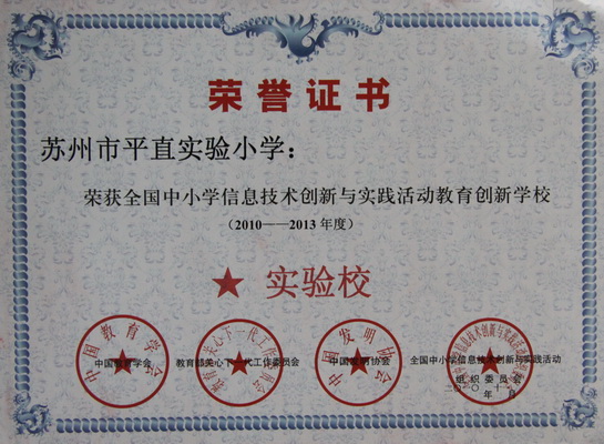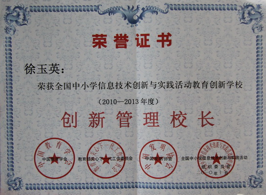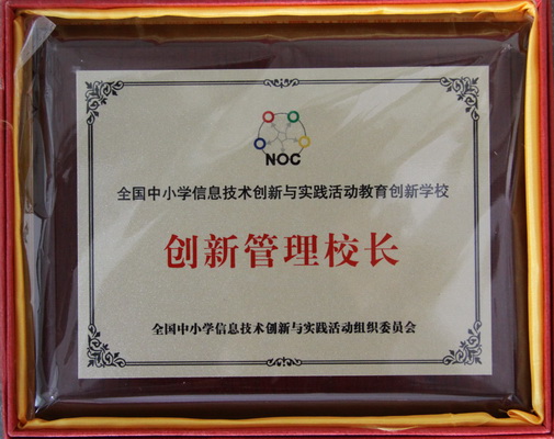 2010年11月26日,在安徽省黄山市隆重举行了“第九届全国中小学信息技术创新与实践活动暨“NOC教育创新学校授牌仪式”。我校在徐校长的带领下屡创佳绩,得到全国NOC组委会专家们的一致认可,在全国100余所学校中脱颖而出,经NOC组委会专家评审,我校被授予 “全国NOC教育创新实验学校”称号(全国有100余所学校申报,首批被授牌的学校为14所),这使学校在今后信息技术教学活动中有了新的努力方向和发展目标。这标志着我校在推进素质教育,加快教育信息化进程中又迈上了一个新台阶。我校徐玉英校长同时也被授予“全国中小学信息技术创新与实践活动教育创新学校创新管理校长”光荣称号。