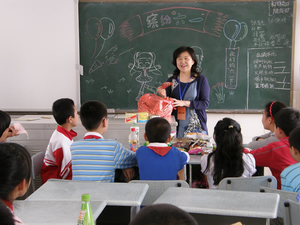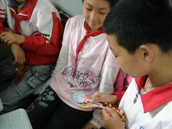 第二节课,谢老师为我们播放了经典日本动画《千与千寻》,同学们看得目不转睛,全神贯注。这时,赵校长进来为我们颁发6·1节礼物——一个棒棒糖和一张书签,虽然礼物轻轻,但同学们却十分珍惜。