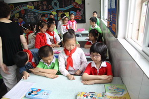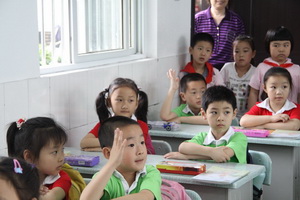 在学校老师们的热情接待下,小朋友兴致勃勃地参观校园 、教室、操场。活动先由低年级的顾老师向孩子们介绍了幼儿园与小学生活的区别,及作为一年级小学生应该遵守的行为规范。而后,小朋友们进入教室,也试着当一回一年级小学生。在一(2)班的教室里,由一年级的小哥哥、小姐姐将幼儿园的弟弟、妹妹领到自己的座位,并手把手地教给他们正确的坐姿和读书、拿笔姿势,齐声朗读了《上课歌》。孩子们亲眼看、亲耳听、亲身体验,纯真的眼睛中闪烁着对未来小学生活的期待与憧憬。