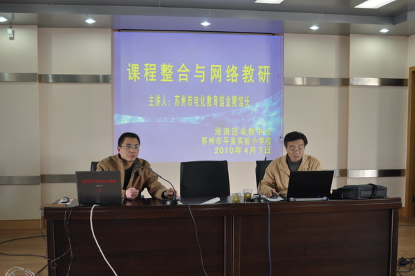 4月7日下午,沧浪区电教中心组织了沧浪区各校信息分管领导及信息整合骨干教师在平直实验小学报告厅聆听了苏州市电化教育馆金陵馆长的关于《网络环境下的教师专业发展》的讲座,金馆长针对一线教师在信息技术与课程整合所遭遇的瓶颈问题进行了细致的阐述与分析,帮助教师们理清了思路,并对即将进行的网络团队竞赛做了针对性的指导,引导教师在今后的教学中带着先进理念进课堂,合理地巧妙地运用信息技术手段,优化教学,构建和谐、高效的课堂。