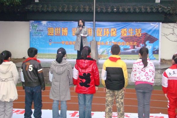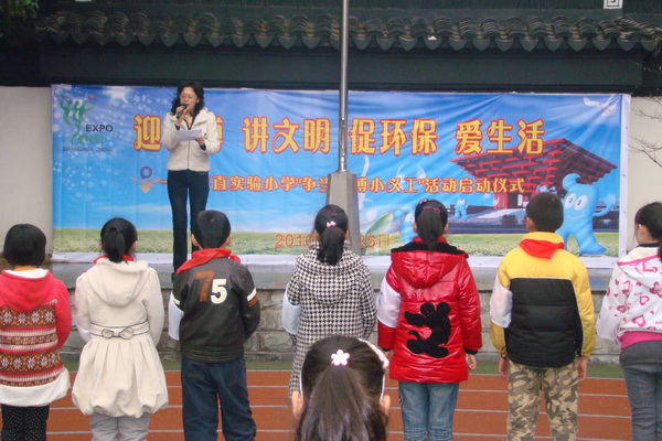 庄重的升旗仪式过后, 进行的是“迎世博,讲文明,促环保,爱生活,平直实验小学争当世博小义工”启动仪式, 学校请来了沧浪区总辅导员徐丹老师,向全区小学生发出“精彩世博,文明先行”的倡议。之后,苏州市妇女儿童活动中的王主任还授予了学校的小朋友们小义工旗帜,鼓励同学们争当文明小义工。