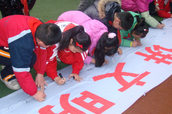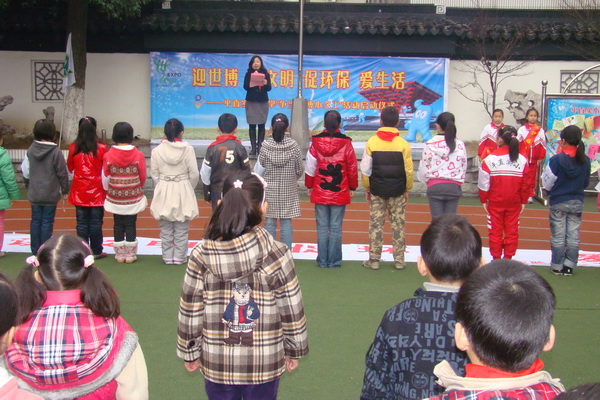 最后,学生们在“迎世博,讲文明,促环保,爱生活,平直实验小学争当世博小义工”的旗帜上签下名字,郑重承诺,要通过我们的双手、至诚至热的心和实际行动来协助上海实现我们每个中国人对全世界的承诺:“城市,让生活更美好!”