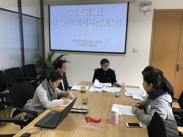 2018年11月8下午2时,苏州市平直实小辅导区党总支书记召集辅导区三校长、书记,传达了“姑苏区校外培训机构专项治理暨教育领域人民群众反应强烈突出问题专项治理”会议精神,要求辅导区三校做到:加强组织领导,落实主体责任;开展专项督查,严格责任追究;强化宣传教育,注重正面引导;严格学校管理,接受社会监督。各学校根据本校实际,成立工作领导小组,制定专项治理工作实施方案,将文教委要求贯彻落实到学校每一位教职员工、学生和家长。辅导区党总支部针对专项治理工作,统一部署,设计制定了《教师个人自查表》、《学校自查表》、《教师承诺书》、《学校公开承诺书》、《告家长书》等文本材料,要求基层学校和教师认真排摸自查,并完成承诺。