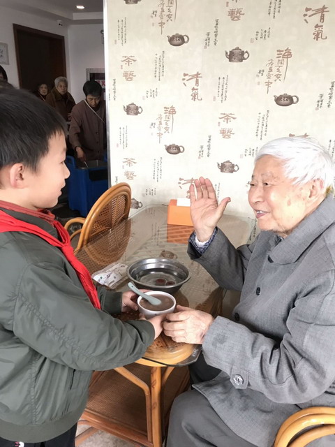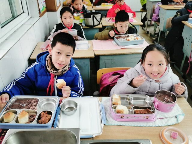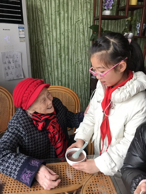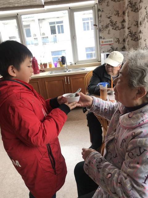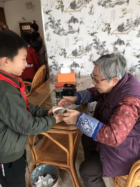 当师生们都沉浸在享受腊八粥美味的快乐时光之中时,也不忘关心我们身边的人。平直的党团员志愿者老师还带领学生代表分别将甜甜的腊八粥送去给培智学校的学生和苏信女儿家的老人们,孩子们和老人们都在平直师生对他们暖暖的关怀中笑开了花。
