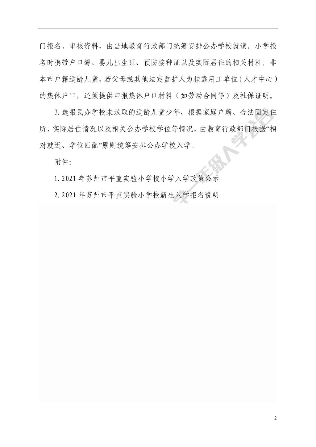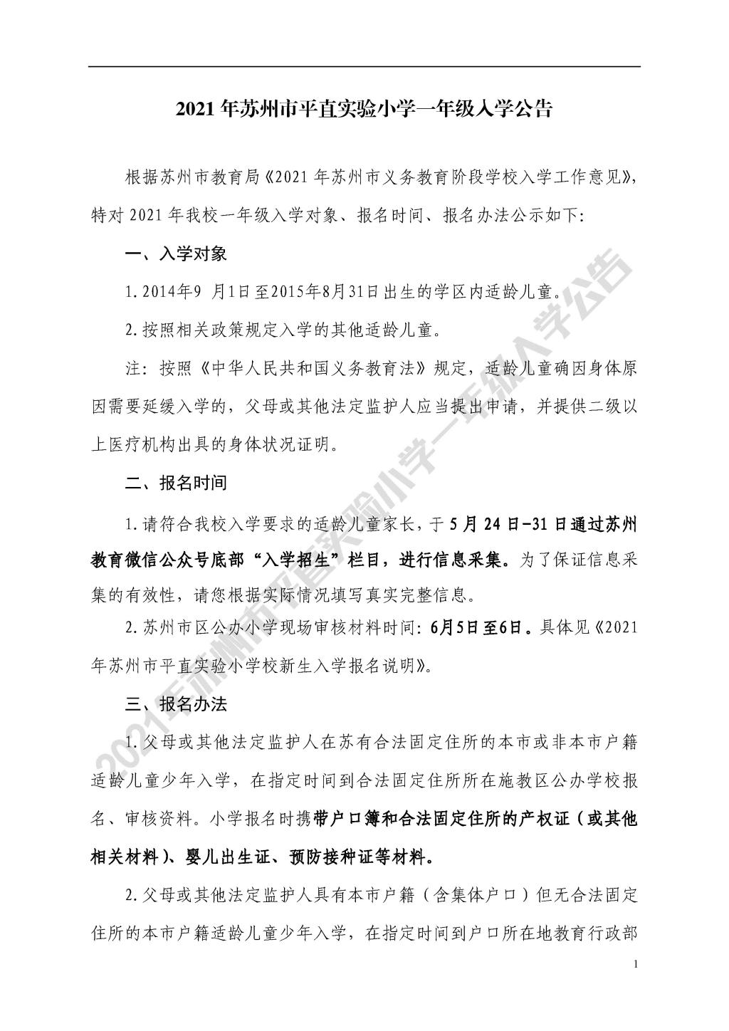 2021年苏州市平直实验小学一年级入学公告