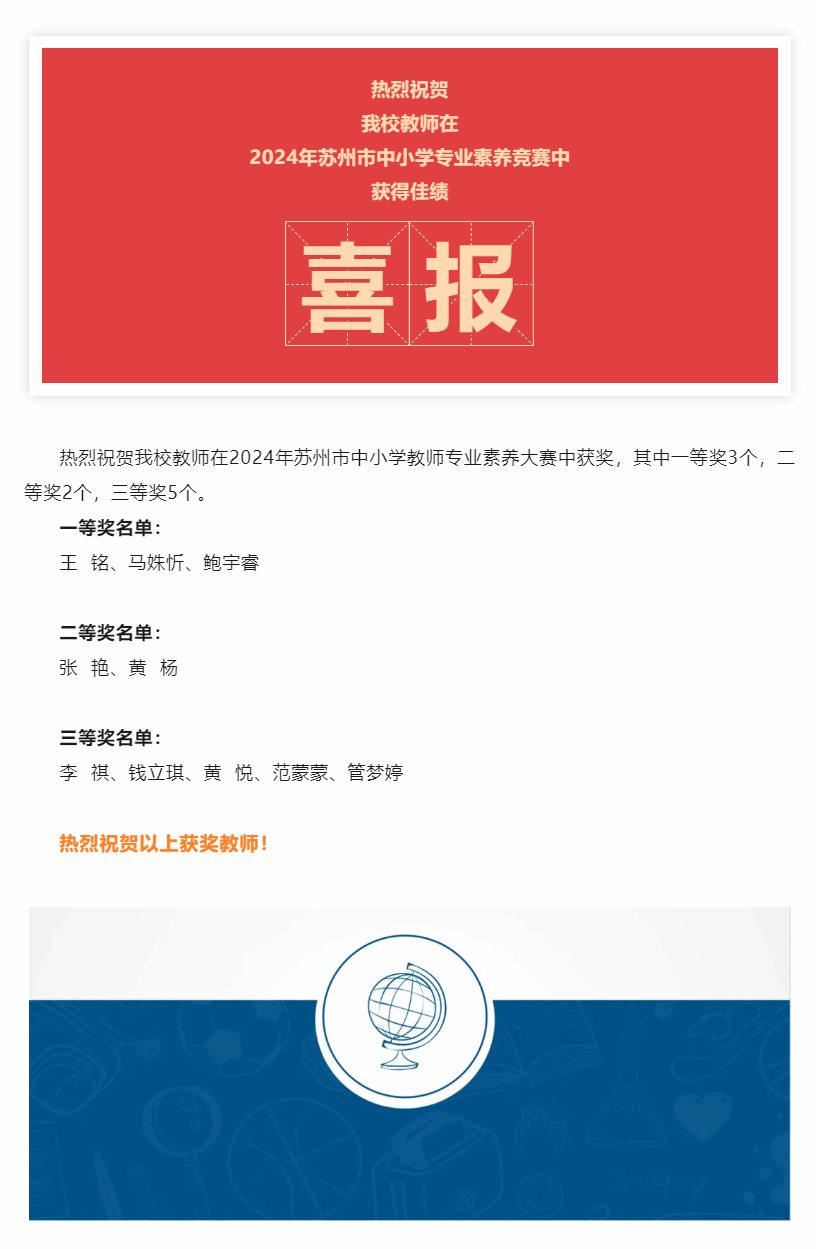 祝贺我校教师在2024年苏州市中小学专业素养竞赛中获得佳绩!