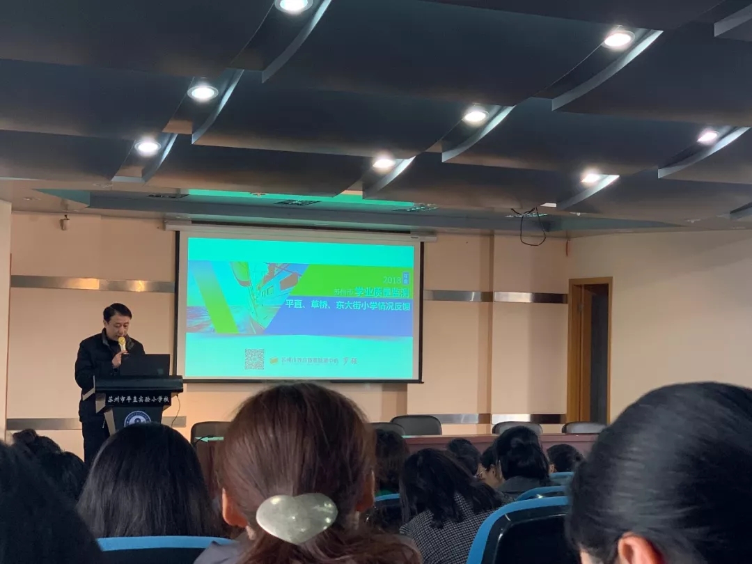 会上,苏州市教育质量监测中心罗强主任对学校2018年学业质量监测结果进行深度反馈,基于数据分析结果简要概括了学业质量中的主要优势和存在问题,并提出了提升教育质量的改进意见。