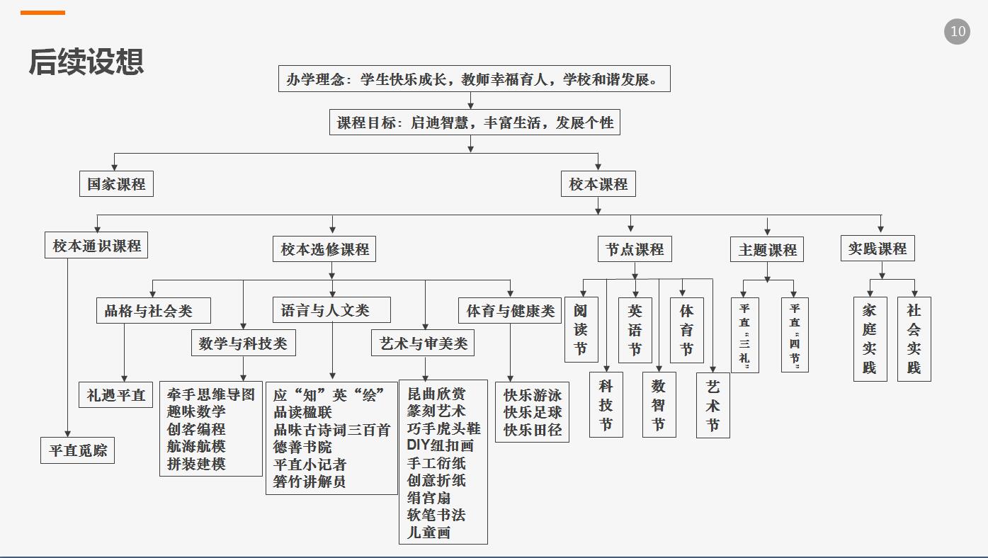 一是进一步完善促进学生多元发展的校本课程体系,使之更科学、更合理、更能彰显平直特色。