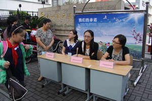老师们谈着心。今天我校在校门口建立心理咨询台,一年级教育咨询台,都接受家长们的咨询。家长们兴致勃勃地询问着在家庭教育中的一些困惑,老师们耐心细致的解答让他们深表感激。