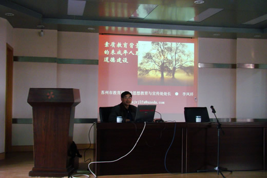 为进一步加强德育管理,提升学校德育工作整体水平,此次培训有幸邀请了苏州市教育局政治思想教育与宣传处李凤祥处长。李处长作了题为《素质教育背景下的未成年人思想道德建设》的专题讲座。李处长旁征博引,生动的事例、幽默的话语,引起了所有人员的思想共鸣。