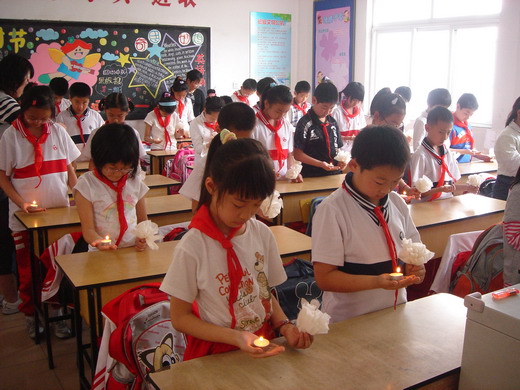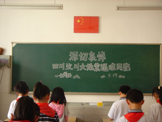 听到这一公告,学校周一的升旗仪式上降半旗志哀,1428分,全校师生集中操场,向遇难同胞默哀3分钟。同时,师生代表在教室里,一手托蜡烛,一手拿白花,寄托对在地震中罹难同胞的哀思。