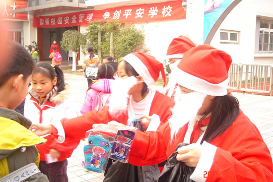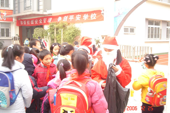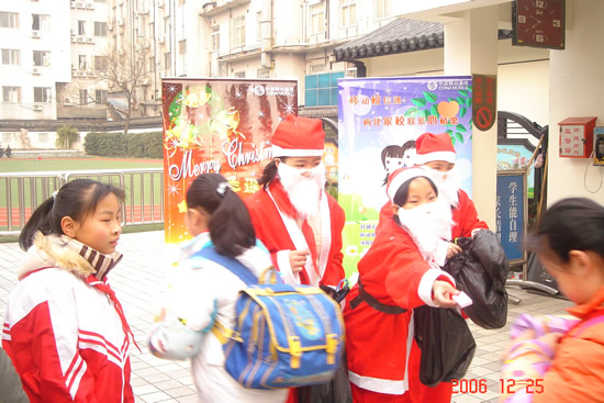 圣诞节当然少不了圣诞老人,今天,当师生早晨踏进校园的时候,我们惊奇地发现圣诞老人竟降临到平直校园了,这是怎么回事呢?哦~原来是学校领导考虑到学校有很多外籍学生,为了让他们能感受到圣诞节的气氛,因此在中国移动通信的大力支持下,组织了这样一次活动。只见大清早学校门口三名学生装扮成的圣诞老人手中拿着大大的礼物袋,在向进校门的小学生派发礼物呢,场面很是壮观,相信通过活动,不仅让平直的外籍学生感受到了亲切感,更让中国学生体验到了圣诞的气氛!作为平直小学的领导及老师,孩子们能健康快乐地成长,是我们最大的心愿,也是我们最希望收到的圣诞礼物!