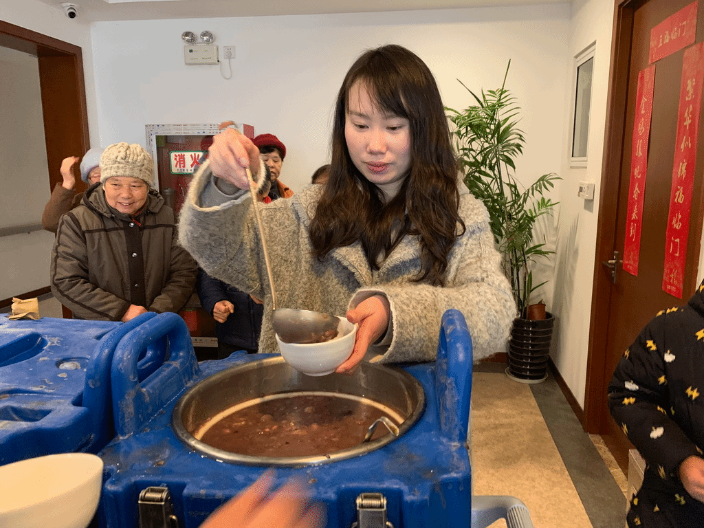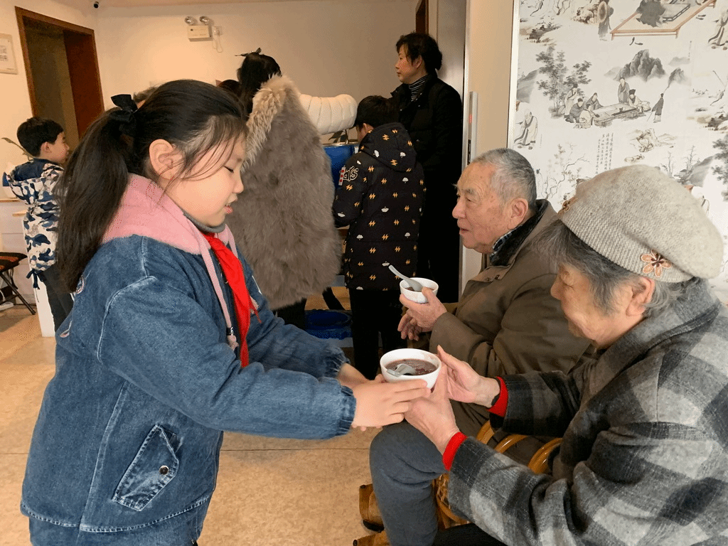 当师生们都沉浸在享受腊八粥美味的快乐时光之中时,也不忘关心我们身边的人。平直的党员志愿者老师还带领学生代表分别将甜甜的腊八粥送去给培智学校的学生和苏信女儿家的老人们,孩子们和老人们都在平直师生对他们暖暖的关怀中笑开了花。