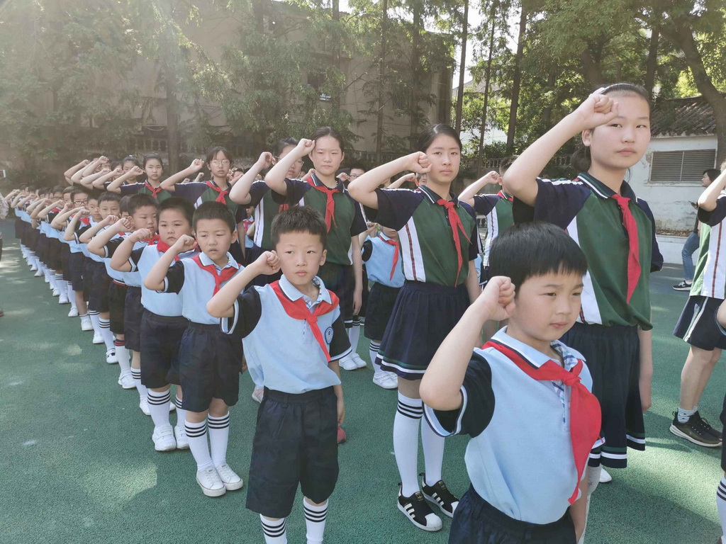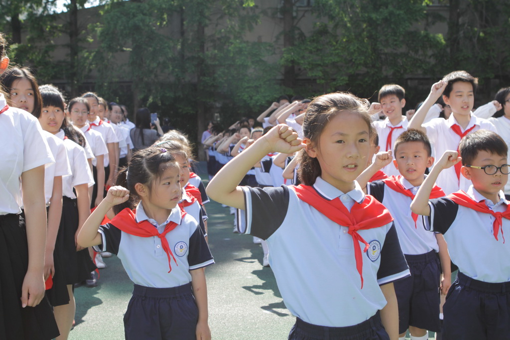 听,新队员们在队旗下的慷慨宣誓;嘹亮的队歌在操场上空萦绕……他们誓做一名优秀少先队员的决心声声震耳。