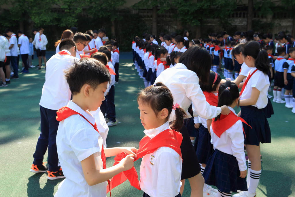 瞧,操场上学生们如一棵棵挺拔的小松树,笔直地站立着,他们屏息凝视着飘扬的队旗,当大队辅导员沈老师宣布入队名单时,全体队员绽放出一张张笑脸,喜悦之情溢于言表;伴随着《红领巾之歌》,六年级队员给新队员们娴熟地佩戴上鲜艳的红领巾!