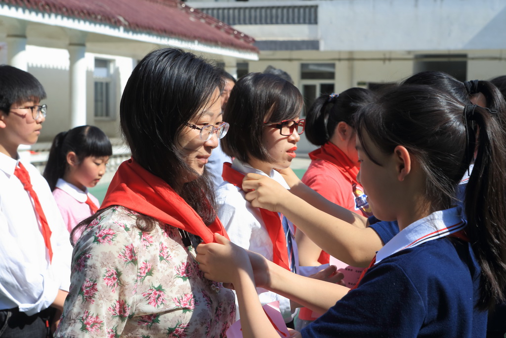 少先队员代表为中队辅导员佩戴红领巾。