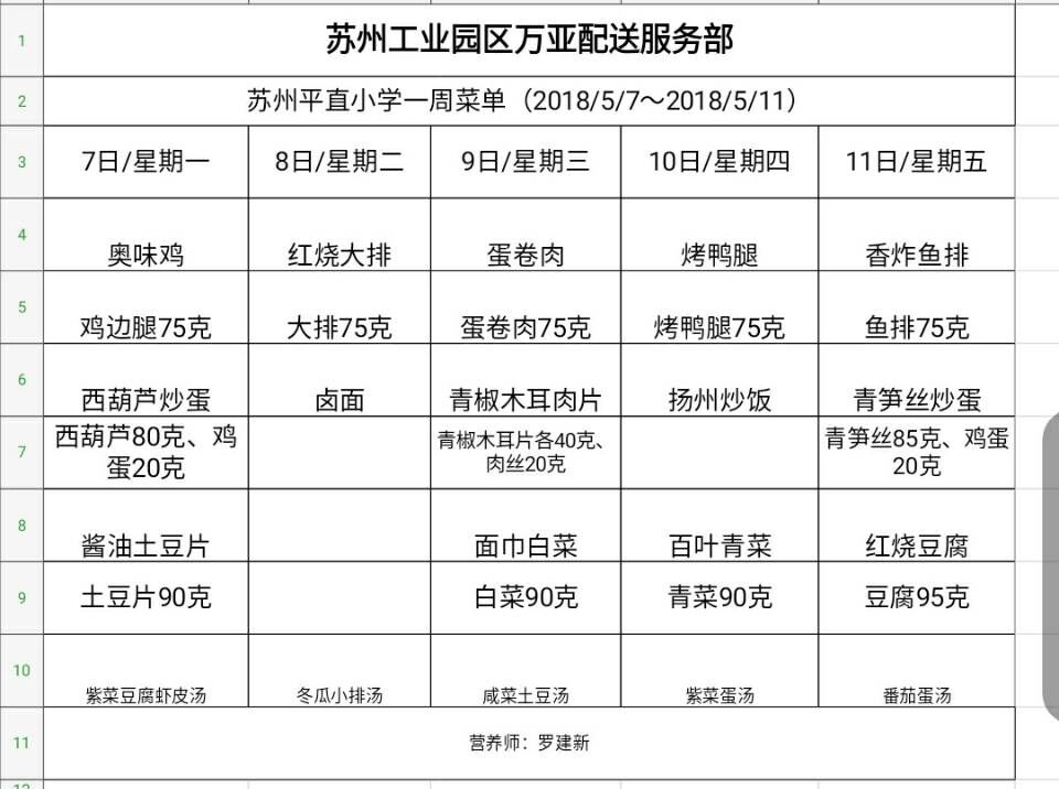 学校2017~2018学年度第二学期第11周菜单