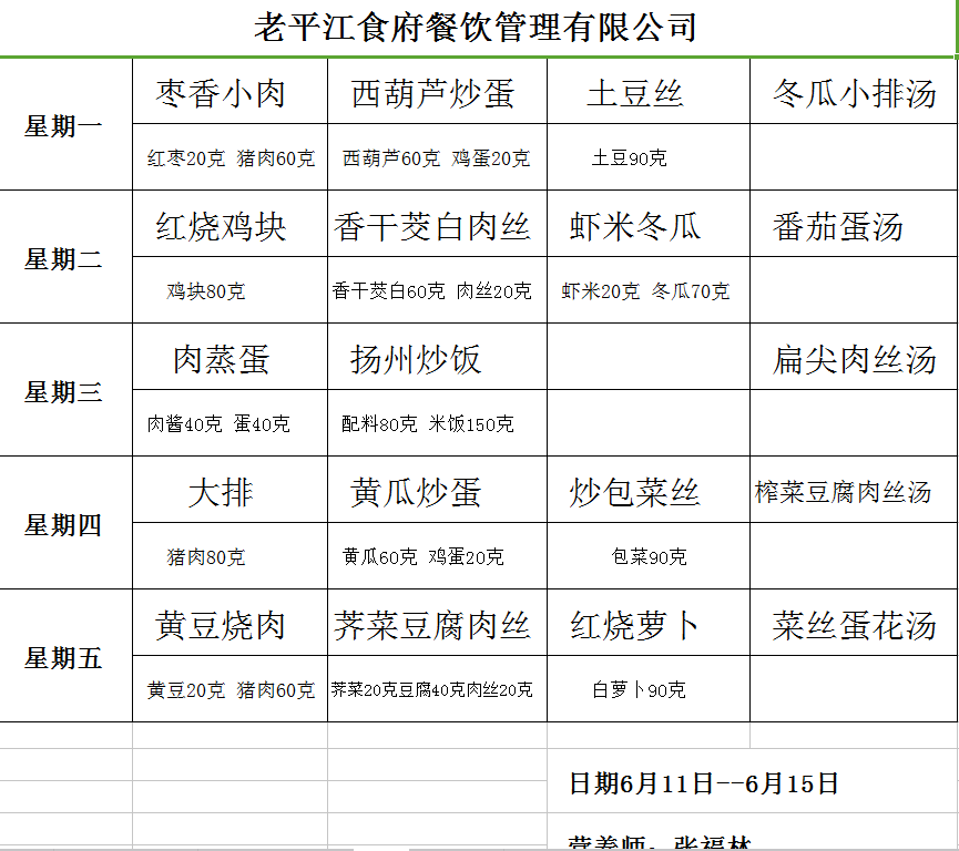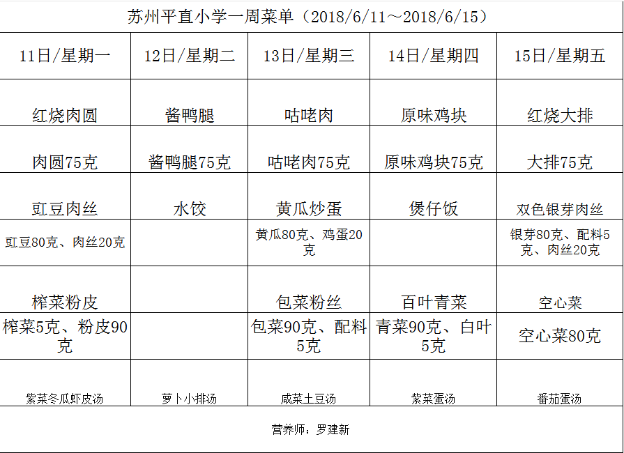 学校2017~2018学年度第二学期第15周菜单