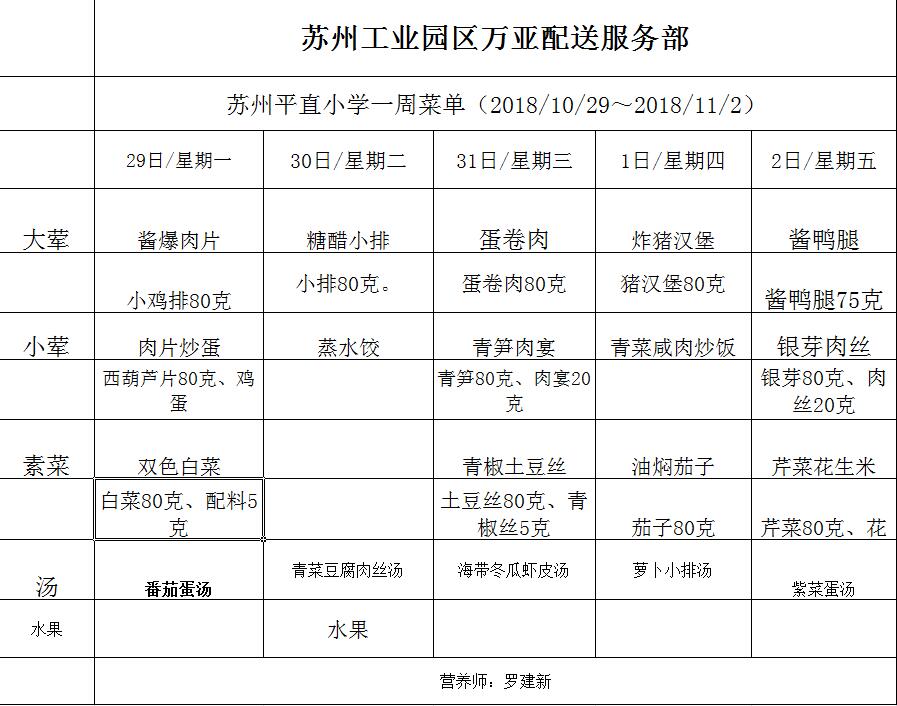 学校2018~2019学年度第一学期第9周菜单