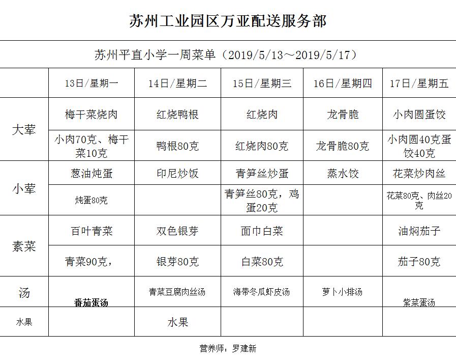 学校2018~2019学年度第二学期第12周菜单