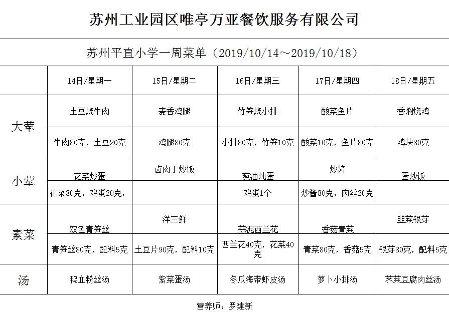 学校2019~2020学年度第一学期第6周菜单