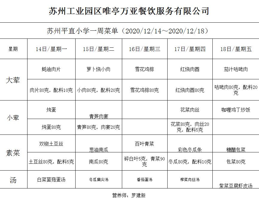 学校2020~2021学年度第一学期第15周菜单